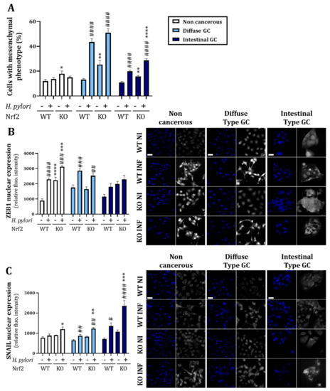 We then evaluated the impact of Nrf2-KO in the context of H. pylori infection. Consistent with the results obtained in the proteomic analysis, we observed an increase in the percentage of cells harboring a mesenchymal phenotype in all three Nrf2-KO cell lines compared to WT (Figure 5A). Moreover, in the cancerous cell lines infected with H. pylori, we observed an increase in cells harboring a mesenchymal phenotype in Nrf2-KO cells compared to WT cells, significant for the intestinal GC (Figure 5A) suggesting that Nrf2 invalidation favors H. pylori-induced EMT. To confirm the results obtained with phenotypic analysis, we analyzed the nuclear expression of two EMT transcription factors, ZEB1 and SNAIL, reflecting their activity. We noticed that Nrf2-KO cells infected with H. pylori expressed more nuclear ZEB1 for the non-cancerous cells and more nuclear SNAIL for the three cell lines (Figure 5B,C).