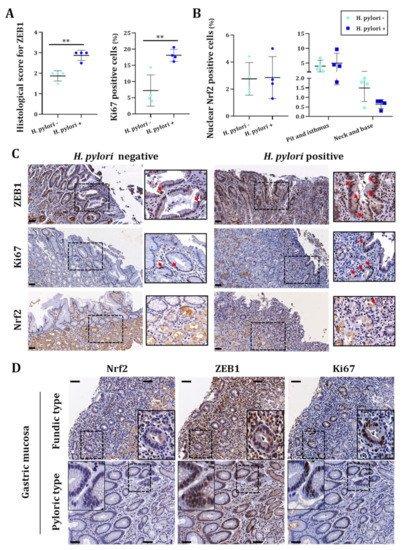 For all markers, more than 600 epithelial cells were counted, and the staining was assessed separately in two zones: (i) in the gastric pits and the isthmus and (ii) in the neck and base. For Ki67 evaluation, the percentage (%) of positive epithelial cells in body-type gastric mucosa was assessed. For ZEB1 evaluation, a mixed score was employed, including labeling (0% = 0; 1–25% = 1; 26–50% = 2; 51–75% = 3; 76–100% = 4) and staining (weak = 1; moderate = 2; intense = 3) indexes as previously described [31]. For Nrf2 evaluation, the percentage of moderate and intense nuclear immunoreactivity in epithelial cells was assessed. Helicobacter pylori immunoreactivity was assessed as follows: negative = 0; positive = 1 (focused immunopositivity); and 2 (diffused immunopositivity).