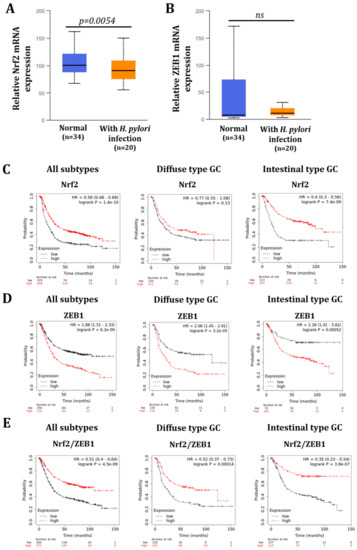 UALCAN cancer database (http://ualcan.path.uab.edu/ accessed on 28 June 2022) [32] was used to investigate gene expression levels of NRF2 (gene NFE2L2) in normal gastric tissues and H. pylori-infected gastric tumors. Overall survival probability of GC patients was analyzed using the KMplot database tool (www.kmplot.com accessed on 28 June 2022) [33]. The JetSet probes used were 239952_at (ZEB1) and 201146_at (NFE2L2, NRF2). Analysis was conducted on all GC cases, or according to their Lauren classification status: diffuse type and intestinal type GC. High or low expression levels in patients’ samples were determined according to the software’s best cut-off value auto-setting and p-values were calculated by a log-rank test.