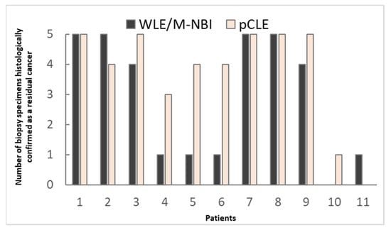 Eleven lesions were predicted to have residual GC on both WLE/M-NBI and pCLE. In the actual biopsy, the presence of residual GC was proven in 10 of 11 lesions via WLE/M-NBI-targeted biopsy (10/11 [90.9%]). The pCLE-targeted biopsy showed the same results (10/11 [90.9%]). We compared the number of histologically confirmed cancer fragments in the targeted biopsy specimens on WLE/M-NBI versus pCLE (Figure 3). A total of 52.2% (32/55) and 74.5% (41/55) of the WLE/M-NBI- and pCLE-targeted biopsy specimens contained GC fragments, respectively, suggesting that pCLE-targeted biopsy is more likely to yield GC tissue. A mean 3.75 (range, 0–5) pieces contained cancer tissue in the pCLE group—significantly higher than the mean 2.90 (range, 0–5) in the WLE/NBI-M group.