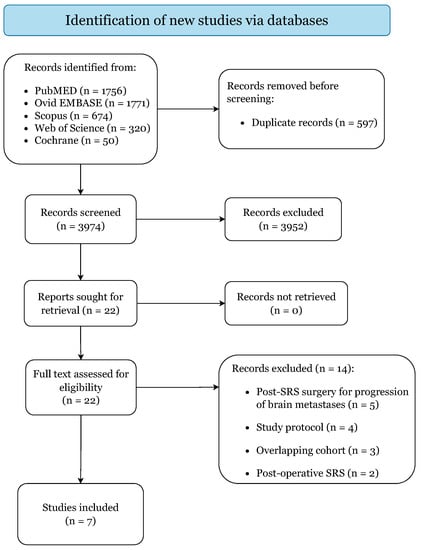 A priori inclusion and exclusion criteria were defined. Studies written in English were included if they reported: (1) the use of NaSRT in single fraction (i.e., neoadjuvant stereotactic radiosurgery; NaSRS), or hypofractionated (NaSRT) protocols, (2) followed by planned surgical resection, (3) in patients with BMs, (4) with available data on management and outcomes. Studies were excluded if they were: (1) literature reviews, study protocols, or book chapters; (2) studies involving patients undergoing salvage surgical resection (i.e., not planned at the time of SRT) for clinical and/or imaging progression of BMs previously treated with radiotherapy; (3) studies involving patients receiving post-operative SRT. In case of studies involving identical cohorts of patients receiving NaSRT at the same institution, only the most recent were included.