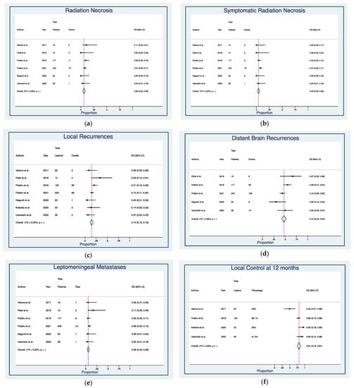 The software STATA 17.0 (StataCorp LLC, College Station, TX, USA) was used and bilateral p-values < 0.05 were considered significant for all statistical tests. Continuous variables are summarized as medians and ranges, while categorical variables as frequencies and percentages. Indirect meta-analyses were conducted for rates of radiation necrosis, local and distant failure, LM, LC, and OS. Pooled proportions of events (effect size, ES) were utilized to summarize outcomes, and the Wilson score method to compute confidence intervals (CI), both presented with forest plots [21]. The Freeman-Tukey transformation was operated to include studies with 0 or 1 event rate and to stabilize variance, and the DerSimonian and Laird approach for random effect models was applied to account for high between-studies variability [22,23]. Heterogeneity was assessed using the Higgins I-square (I2) and considered significant for I2 > 75% [24]. Publication bias was evaluated by detecting any evident visual asymmetry on generated funnel plots.