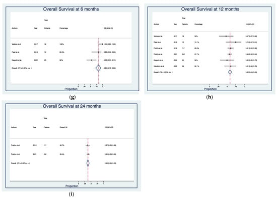 Forest plots of rates of (a) radiation necrosis [21,25,26,28,29,31], (b) symptomatic radiation necrosis [21,25,26,28,29,31], (c) local recurrences [25,26,27,28,29,30,31], (d) distant brain recurrences [26,27,28,29,31], (e) leptomeningeal metastases [25,26,27,28,29,31], (f) local control at 12 months [25,27,30,31], and overall survival at (g) 6 months [25,26,29], (h) 12 months [25,26,27,28,29,31], and (i) 24 months [27,28]. Squares define the proportions (effect size, ES) of individual studies and horizontal lines mark the 95% confidence intervals (CI). Diamonds indicate the pooled ES with 95% CI using the random effect model meta-analyses.