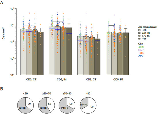 The immune infiltrate and Immunoscore in patients based on age. (A) Patients were grouped according to their age: <60 years (orange), ≥60–70 (yellow), ≥70–85 (purple), and ≥85 (blue). Immune densities of CD3 and CD8 quantified in the tumor core (CT) and invasive margin (IM). Each dot represents the mean whole-slide quantification for one patient. (B) Distribution of Intermediate and High (Int+Hi) versus Low (Lo) Immunoscore in age-based patient groups. AHM (Ahmedabad, India); SAP (Sapporo, Japan); TOK (Tokyo, Japan); XIA (Xi’an, China).