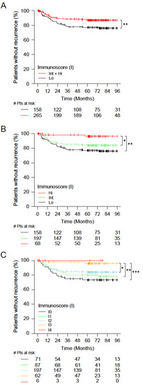 The distribution of Immunoscore was 62.6% High+Int and 37.4% Low in two categories; 16.1% High, 46.6% Intermediate, and 37.4% Low in three categories; and 1.4%, 14.7%, 46.6%, 20.6%, and 16.8% in Immunoscore I4, I3, I2, I1, and I0, respectively. The two categories of Immunoscore enabled the identification of patients with distinct clinical outcomes for TTR (Figure 2A and Table 1). High-Immunoscore patients (63%) had a significantly longer survival for TTR (Hazard Ratio of HRLo/Int+Hi = 1.9 (1.17−3.1), p = 0.0097) and a higher 5-year recurrence-free rate (Hi: 86.9% (82.7–91.4%); Lo: 77% (70.5–84.1%)). The three categories of Immunoscore also enabled the identification of patients with distinct clinical outcomes for TTR (Figure 2B, Table 1). High-Immunoscore patients had a significantly longer survival for TTR (HRLo/Hi = 7.26 (1.75−30.19), p = 0.0064, and Trend p = 0.0025) and a higher 5-year recurrence-free rate (Hi: 96.3% (91.3–100%), Int: 84% (78.7–89.6%), and Lo: 77% (70.5–84.1%)). Even more striking differences were observed for the Immunoscore in five categories (Figure 2C and Table 1). High-Immunoscore patients had a significantly longer survival for TTR (HR(I0/I3) = 7.75 (1.8−33.4), p = 0.006, and Trend p = 0.0019) and a higher 5-year recurrence-free rate (I4: 100% (100–100%), I3: 96% (90.7–100%), I2: 84% (78.7–89.6%), I1: 80% (71.7–89.3%), and I0: 73.5% (63.6–84.8%)) (Table 1). Forest plots are illustrated in Figure S1. Similar results were found for OS and DFS (Table S2).