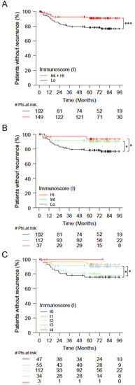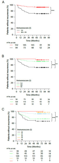 The outcomes of stage I–III colon cancer patients according to Immunoscore. (A–C) Kaplan–Meier curves of Immunoscore for stage I–III patients are shown for time to recurrence (TTR). (A) Two Immunoscore categories: Lo (0–25%, black) and Int+Hi (>25–100%, red). (B) Three Immunoscore categories: Lo (0–25%, black), Int (>25–70%, green), and Hi (>70–100%, red). (C) Five Immunoscore categories: I0 (0–10%, black), I1 (>10–25%, green), I2 (>25–70%, azure), I3 (>70–95%, orange), and I4 (>95–100%, red). Significant log-rank p-values are marked as *** p < 0.005, ** 0.005 ≥ p < 0.01, and * 0.01 ≥ p < 0.05.