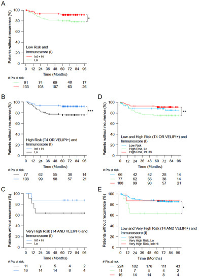 In low-risk stage II patients, Immunoscore was also significantly associated with TTR (unadjusted HRLo/Int+Hi = 2.62 (1.21−5.68), p = 0.0146), and the 5-year recurrence rate was 91.6% (86.7–96.7%) for patients with a High Immunoscore and only 80.2% (72.2–89.1%) for those with a Low Immunoscore (Figure 5A). Thus, patients with a Low Immunoscore at low pathological risk were in fact at high risk of recurrence. In high-risk stage II patients (T4 or VELIPI+), Immunoscore was significantly associated with TTR (unadjusted HRLo/Int+Hi = 3.11 (1.39−6.91), p = 0.0055), and the 5-year recurrence rate was 91.5% (86.4–97%) for patients with a High Immunoscore and only 75.8% (66.6–86.2%) for those with a Low Immunoscore (Figure 5B). In very high-risk stage II patients, Immunoscore was also associated with TTR, with a 5-year recurrence rate of 87.5% (72.7–100%) for patients with a High Immunoscore and only 63.6% (40.7–99.5%) for those with a Low Immunoscore (Figure 5C). Strikingly, patients with high-risk or very high-risk stage II and a High Immunoscore had a good outcome, similar to the rest of the Stage II cohort with lower risk (Figure 5D,E; Table S3).