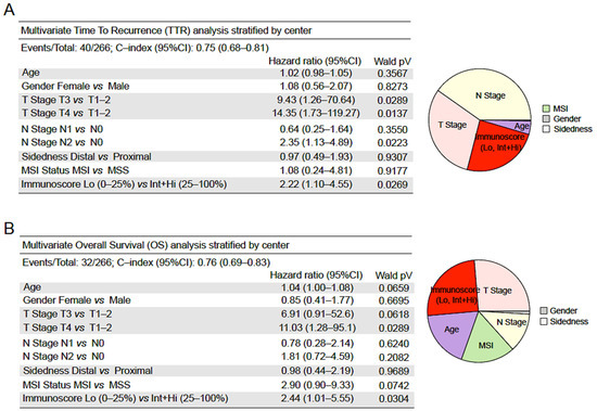 Cox multivariable analyses adjusted for Immunoscore, age, gender, T-stage, N-stage, sidedness, and MSI and stratified by city center revealed the significant prognostic value of Immunoscore (Figure 6). In a multivariable model, age, gender, T-stage (T3 vs. T1–2), N-stage (N1 vs. N0), sidedness, and MSI were not significant. Among tumor-related parameters, only T-stage ((T4 vs. T1–2), HR = 14.35 (1.73–119.27), p = 0.0137) and N-stage ((N2 vs. N0), HR = 2.35 (1.13–4.89), p = 0.0223) were significant for TTR (Table S4). The Immunoscore in two categories (Lo/Int+Hi) was significant in Cox multivariable analyses, with HR = 2.22 (1.10–4.55), p = 0.0269. Cox multivariable analyses for OS and DFS showed similar results, with significant p-values for Immunoscore in OS (p = 0.0304) and DFS (p = 0.0516).