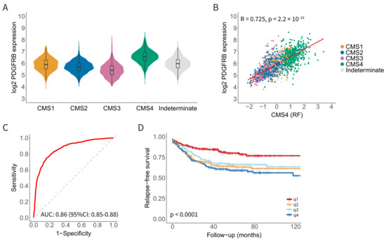 Platelet-Derived Growth Factor Receptor beta (PDGFRB) mRNA expression identifies Consensus Molecular Subtype 4 (CMS4) colorectal cancer (CRC) with high specificity and sensitivity. (A) Violin plot showing PDGFRB expression in the CMS subgroups in a composite RNA sequencing cohort of 3232 primary CRC tumours. (B) Scatter plot showing a strong correlation between PDGFRB expression and the CMS4-identifying gene set (n= 143 genes; CMS4 (RF)) from the CMS classifier in the composite CMS-3232 cohort. (C) Receiver operating characteristic (ROC) curves showing the sensitivity and specificity of using PDGFRB mRNA levels to distinguish between CMS4 and CMS1-3. The Area Under the Curve (AUC) value is shown, as a measure of the diagnostic accuracy of the PDGFRB test. (D) Kaplan–Meier curves displaying relapse-free survival probabilities in subgroups defined by PDGFRB expression quartiles, n = 805 patients. There is a significantly worse relapse-free survival probability in the higher PDGFRB expression quartiles.