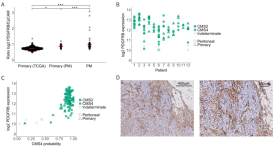 PDGFRB expression in CMS4 peritoneal metastases. (A) Relative PDGFRB expression levels in the TCGA cohort (primary CRC tumours, n = 592) versus the peritoneal metastasis cohort (primary tumours with peritoneal dissemination, n = 35, and the peritoneal metastases derived from them, n = 59). Each dot represents a tumour sample, the red bar represents the median PDGFRB/EpCAM ratio. (B) Dot plot showing PDGFRB expression levels in primary tumours and their matched peritoneal metastases. Tissue type (primary vs. PM) is annotated by shape and CMS classification is color-coded. (C) Scatter plot showing the correlation of CMS4 probability with PDGFRB mRNA levels in the peritoneal metastasis cohort. PDGFRB mRNA levels correlate very well with CMS4 probability of the same lesions. (D) Immunohistochemistry for PDGFRB on peritoneal metastasis tissue from the same peritoneal metastasis cohort. The tumour stroma of 17/18 peritoneal metastasis was positive for PDGFRB. Significance levels * p < 0.05, *** p < 0.001.