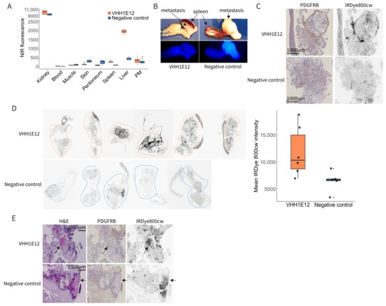 Tumour accumulation and the biodistribution of VHH1E12-IRDye-800cw was assessed by imaging the near-infrared (NIR) signal in a mouse xenograft model of peritoneal metastases. Four hours after the intravenous injection of either VHH1E12 or the anti-HIV nanobody used as a negative control, the mice were euthanized, and organs and peritoneal metastases were imaged ex vivo in the Pearl Imager. Looking at the biodistribution of both compounds in healthy tissue, there was a significantly higher uptake of VHH1E12 in the liver (Figure 4A). Cryosections of liver tissue showed a diffuse uptake of VHH1E12 and almost no PDGFRB expression, making it unlikely that the uptake in the liver of VHH1E12 is caused by specific binding to PDGFRB.