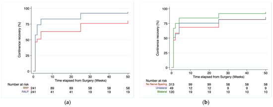 Kaplan–Maier curves (Figure 1) confirmed a significant difference in continence rates between techniques (Figure 1a), especially in those who received a bilateral nerve sparing (Figure 1b).