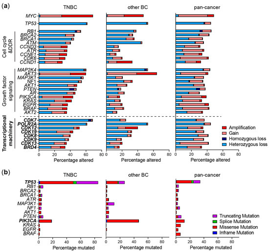 Genomic alterations of frequently altered pathways and the transcriptional machinery (TM) in TNBC. (a) Copy number alterations and (b) mutations in genes from TNBC patients from the METABRIC study (TNBC and other BC) or TCGA (pan-cancer) derived from cBioportal. Shown are the most frequently altered genes within cell cycle, DNA damage response (DDR) and growth factor signaling pathways.