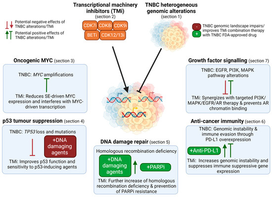 Several components of the TM can be effectively and selectively targeted, such as transcriptional cyclin-dependent kinases (CDK) and bromodomain and extra-terminal (BET) proteins that induce transcription by regulating RNA polymerase II activity. Understanding how these TM inhibitors (TMi’s) interact with various cancer drivers is critical to rationally design therapeutic strategies, for example, biomarker-based patient selection and combination therapies. In this review, we discuss: (1) how the TM can be targeted; (2) how its activity is altered in TNBC; and, (3) how it interferes with the heterogeneous TNBC drivers. Overall, this review identifies the opportunities, challenges and knowledge gaps concerning the genomic landscape of TNBC and its indirect targeting by TMi’s (Figure 2).