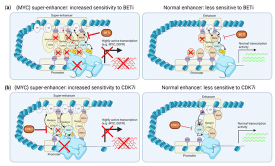 TMi’s, including CDK7 and BET inhibitors, can specifically suppress transcription promoted by so-called “super-enhancers”, including the transcription of many (TNBC) oncogenic drivers, such as MYC (Figure 3a,b). Super-enhancers are genomic regions that contain multiple clusters of active enhancers. They are characterized by enriched H3K27Ac modifications and enriched binding of multiple transcription coactivators, such as MED1 and BRD4, which strongly drive transcription [45]. BRD4 binds to H3K27Ac on enhancers. While BRD4 thereby binds both normal enhancers and super-enhancers, super-enhancer driven transcription is more sensitive to BRD4 inhibition than transcription driven by normal enhancers (Figure 3a) [46,47,48,49]. While the exact mechanism of increased sensitivity of super-enhancers over normal enhancers is not fully understood, BRD4 inhibition more strongly reduces binding of BRD4 to super-enhancers than to normal enhancers [49]. As MYC overexpression is frequently caused by super-enhancer driven transcription, this super-enhancer suppression by BET inhibitors is therefore strongly associated with reduction of MYC expression and MYC-driven transcription. Accordingly, c-MYC- or N-MYC-driven cancer cells, including TNBC, are more sensitive to BRD4 inhibition [47,50,51,52]. However, as not all studies evaluated the presence of super-enhancers around the MYC or NMYC gene, it is unclear whether this selective inhibition of c-MYC or N-MYC is solely effective when MYC overexpression is driven by super-enhancers, or also when the MYC or NMYC genes themselves are amplified, without a gain in super-enhancer activity. Ectopic expression of MYC confers resistance to BRD4 inhibition, supporting the notion that BRD4 inhibition is mainly effective for inhibiting super-enhancer driven MYC expression [53]. Importantly, although evaluated in TNBC cell lines and a small number of TNBC tumors [48,54,55], the super-enhancer landscape in TNBC tumors, including the frequency of super-enhancer driven MYC expression, is yet to be defined.