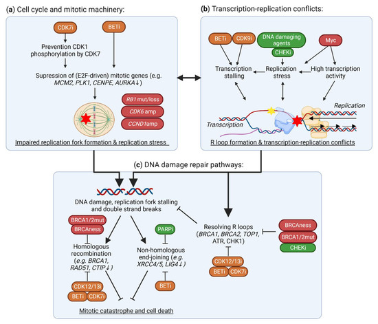 In addition to specific regulation of DNA damage genes, TMi’s can also suppress expression of genes involved in the DNA replication machinery (Figure 4a). BET inhibitors reduce expression of multiple DNA replication genes, including AURKA, AURKB, CDK4 and CCND1, in multiple cancer types, including TNBC [136,137,138,139,140]. Thereby BETi’s sensitizes cancer cells, even in RB1-deficient cells, to CDK4/6 inhibitors, which have currently been approved for the treatment of hormone-positive breast cancers [136,137,138,139]. BET inhibitor resistance is associated with upregulation of cell cycle genes, including AURKA and PLK1, which induces a therapeutic vulnerability to PLK1 inhibitors [141]. Specific regulation of cell cycle genes may be regulated through co-recruitment of BRD4 with E2F1 on their promoter. On the contrary, CDK8 represses E2F1 activity, thereby stimulating the β-catenin pathway and stemness [61]. Selective CDK7 inhibition does not globally reduce RNA polymerase II phosphorylation, but rather reduces phosphorylation of CDK1 by CDK7 and consequently, E2F-driven, cell cycle-related gene expression [142,143]. Inhibition of E2F-driven transcription has also been observed after CDK7 inhibition due to its super-enhancer related gene repression [144]. Moreover, a therapeutic vulnerability to CDK7 inhibition is induced through kinome re-wiring upon CDK4/6 inhibition, which results in increased EGFR signaling [145]. In addition, TNBC tumors often have CCND1 amplifications, and CCND1 overexpression reduces global transcription activity and increases RNA polymerase II pausing, thereby sensitizing lymphoid tumor cells to inhibition of the TM via CDK7 or CDK9 [146]. In addition, CDK12 inhibition repressed expression of DNA replication genes [114]. Finally, CDK12-mutant associated tandem duplications in prostate cancer are enriched for duplication of cell cycle-related genes, such as MCM7 and CCND1, compared to other tandem duplication phenotypes [120,147]. This could indicate that CDK12-mutant tumors are more dependent on the expression of these genes, or that these genes are duplicated due to transcription stalling and subsequent DNA damage around these genes.