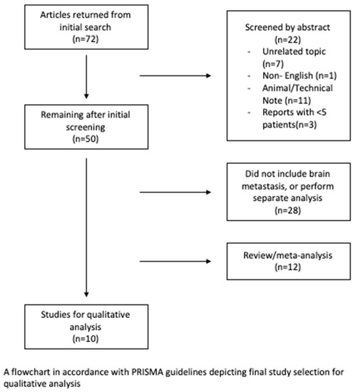 A systematic review of the current literature regarding the management of recurrent brain metastasis with laser interstitial thermal therapy was conducted according to PRISMA guidelines (Figure 1). Articles were selected from the MEDLINE (PubMed) database. The following search string was used: (“laser interstitial thermal therapy” OR “LITT” OR “laser ablation”) AND ((“recurrent” OR “progressive” OR “progression”) AND (“brain” OR “cerebral” OR “intracranial”) AND (“metastases” OR “tumor”)). The search returned 72 articles. After the evaluation of the search results against the inclusion criteria, 10 articles remained for the qualitative analysis. Several studies were multicenter analyses; therefore, they may have had unavoidable overlap in patients, although likely minimal and infrequent.