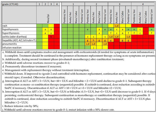 Recommendations for therapy management of immune checkpoint inhibitors (ICI) in ICI-based combination therapy depending on type and severity of important irAE. Green: continuation, yellow: interruption, orange: interruption or discontinuation under certain conditions, red: permanent discontinuation. Assessment based on the respective Summaries of Product Characteristics (SmPC) of the European Medicines Agency (EMA) (accessed 22 July 2022). (ir)AE, (immune-related) adverse event; ALT, alanine aminotransferase; AST, aspartate aminotransferase; Avelu, avelumab; Axi, axitinib; Ipi, ipilimumab; Lenva, lenvatinib; Nivo, nivolumab; Pembro, pembrolizumab; ULN, upper limit of normal range; ↑, increased.