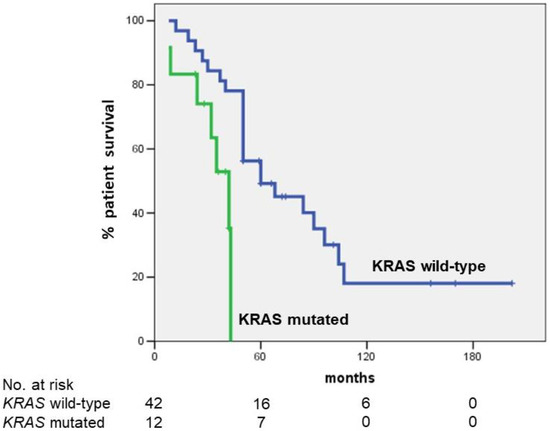 After a mean follow-up of 58.1 months, 16 patients were alive at the last follow-up. The 5-year OS for the total group of 54 patients was 42.0% (median OS: 50 months). Five-year OS in patients with KRAS mutation was significantly lower than that observed in patients with KRAS wild type (0 vs. 49.2%, respectively; p = 0.003) (Figure 1).