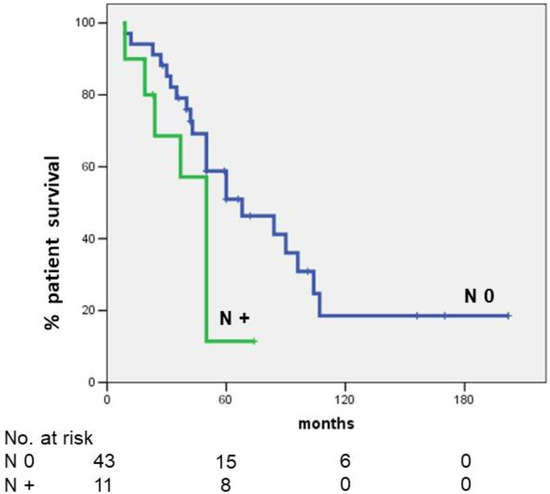 Five-year OS in patients with lymph node metastases was significantly lower than that observed in patients without lymph node metastases (11.4 vs. 51.0%, respectively; p = 0.023) (Figure 2).