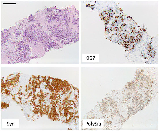 In each case, diagnostic tissue samples were collected by transbronchial forceps biopsy or endobronchial ultrasound-assisted transbronchial needle aspiration (abbr. EBUS-TBNA) and evaluated by conventional light microscopy. Monoclonal antibody 12E3 (mouse IgM) (Thermo Fisher Scientific Inc., Waltham, MA, USA), which binds to polySia of highly polysialylated NCAM, was used as the primary antibodies. Histologic slides of the appendix were on-slide controls. The detection of the monoclonal antibody 12E3 bound to polySia-NCAM was performed using an OptiView DAB IHC Detection Kit with a BenchMark Ultra Autostainer (both from Roche Diagnostics GmbH, Mannheim, Germany). A three-level evaluation score was applied for the assessment of immunostaining: 0 = no polySia, + = weakly positive, ++ = strongly positive. The markers synaptophysin, chromogranin A and CD56 (NCAM) as well as the Ki-67 proliferation index were also recorded.