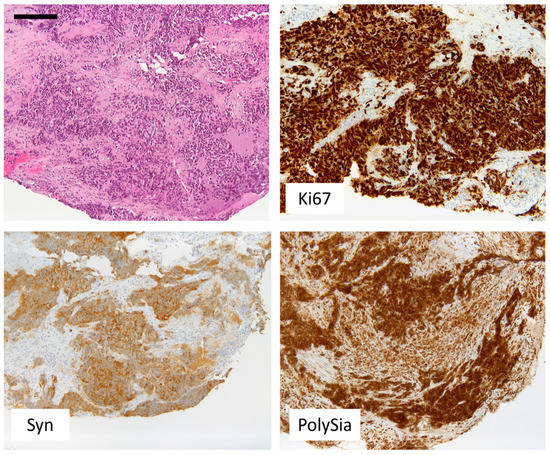 Representative immunohistochemistry of small cell carcinoma (SCLC) with high proliferation index (Ki-67, >95%), positivity for synaptophysin (Syn) and strong expression of polySia-NCAM (PSS). Bar, 500 µm.
