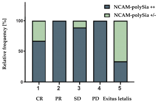 Treatment response was evaluated according to RECIST 1.1 criteria. In the partial remission (abbr. PR) and progressive disease (abbr. PD) categories, all patients were strongly polySia-NCAM-positive. In the categories of complete remission (abbr. CR) and stable disease (abbr. SD), all patients showed an absent or weak polySia -NCAM expression (Figure 5). Given this, there was no significant correlation between disease progression and polySia-NCAM expression (p = 0.0759). Using sphere volumes, the correlation between treatment response and polySia-NCAM expression narrowly failed to reach significance (p = 0.0580).
