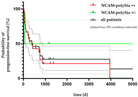 Kaplan-Meier progression-free survival analysis. The black curve shows the progression-free survival of the complete cohort. In the patient group with strong polySia-NCAM expression (red curve), progressive disease (abbr. PD) occurred in five patients. Another 12 patients died from disease. The median time to progressive disease (abbr. PD) or death was 395 days. The patient group with weak or no polySia-NCAM expression (green curve) was underrepresented with four patients. The median survival time was 21,164.5 days. This high number is because the two patients could be followed up for a very long time. With a p-value of 0.4198, the log-rank test revealed no significant difference between the two curves according to polySia-NCAM expression.