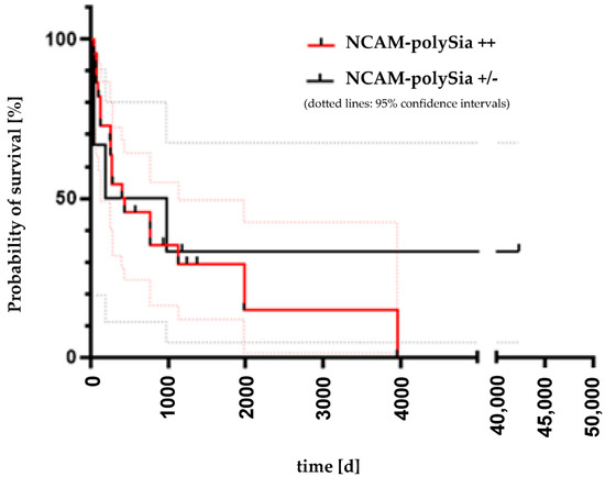 Kaplan-Meier overall survival analysis in relation to polySia-NCAM expression. The patient group with strong polySia-NCAM expression (red curve) included 22 patients. Of these, 17 patients died within the observation period of the study. The median survival time in the strongly polySia-NCAM positive group was 411 days. The patient group with no or weak polySia-NCAM expression (black curve) included 6 patients, 4 of these patients died from disease. The median survival time was 578.5 days. The log-rank test showed no significant difference between the two curves according to polySia-NCAM expression. (p = 0.6918).