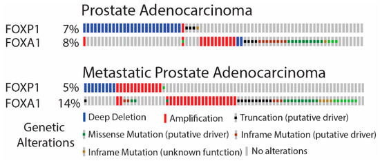 Figure 1. FOXA1 and FOXP1 are highly mutated in primary and metastatic prostate adenocarcinoma. The mutation frequency of FOXA1 and FOXP1 in primary PCa was assessed in a TCGA data set containing 501 samples (Firehose Legacy). The mutation burden in metastatic prostate cancer was assessed in the SU2C/PCF Dream Team data set containing 444 samples. Data were generated from cBioPortal.org (accessed on 5 February 2020).