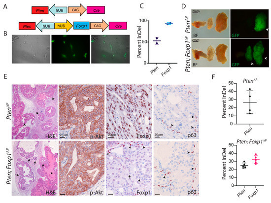 Figure 2. CRISPR generated loss of Foxp1 and Pten in the murine prostate. (A) AAV constructs for expression of sgRNAs to Pten or Pten and Foxp1 together with expression of Cre protein were generated. (B) Validation of the AAV particles were conducted in MEF isolated from Cas9-EGFPflox/flox mice. The expression of EGFP revealed viral transduction and Cre expression from the viral construct. Images were taken with 10× magnification (C) The efficiency of the sgRNA was determined with Sanger Sequencing and analysed with Synthego ICE software. (D) The AAV particles were delivered to the murine prostate with surgical injections and prostate tissues were examined 4 months post-treatment. White arrowheads mark transformed areas in the prostatic tissues (representative image, n = 5). (E) Paraffin sections from the prostates were stained for H & E (arrows mark PIN and arrowheads mark normal prostatic epithelial), p-Akt, Foxp1 and p63 (brown stain) to confirm PIN formation and disruption to the Pten pathway and loss of Foxp1 in the Cas9-EGFP transgene mice (n = 5). Arrows mark cells depleted for Foxp1 and arrowheads mark cells positive for Foxp1 or p63. (F) Indel frequency was measured on EGFP-positive biopics from the anterior prostate lobe. Sanger Sequencing data were analysed with Synthego ICE software (n = 4–5).
