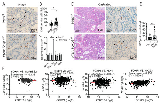 Figure 3. Loss of Foxp1 increases proliferation and expression of Tmprss2 in the prostate in an androgen manner. (A) Tissue sections from the anterior prostate lobes from Pten and Pten; Foxp1 deficient samples were stained for Ki67 (n = 5). (B) Quantification of Ki67-positive cells was assessed from a total of 25 fields from five mice (* = p < 0.05). (C) Expressions of AR-regulated genes were measured from Pten and Pten; Foxp1-deficient samples (n = 4, * = p < 0.05). (D) Mice deficient in Pten or Pten; Foxp1 in the prostatic tissues underwent castration one month before samples were collected. Tissue sections were stained with H & E and Ki67. Black arrowheads mark positive cells (brown stain) (n = 5). (E) Ki67-positive cells were quantified from both genotypes from a total of 15 fields (ns = non-significant). (F) The correlation between FOXP1 and AR-regulated genes was assessed from the TCGA Pan Cancer data set containing 494 samples.