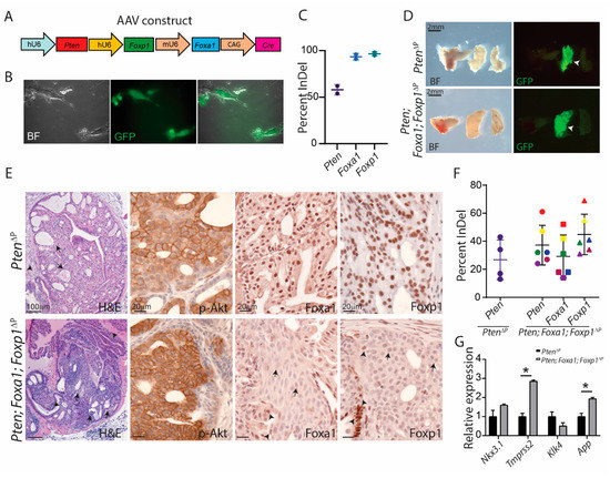 Figure 4. CRISPR-mediated mutations of Foxa1, Foxp1 and Pten in the prostatic epithelium. (A) AAV construct for delivery of sgRNAs targeting Pten, Foxa1 and Foxp1 under pol3 promoters. The construct also contained Cre expression by the CAG promotor. (B) AAV particles were validated in MEF from Cas9-EGFPflox/flox mice and expression of EGFP could be detected after viral transduction. Images were taken with 10× magnification (C) Indel analysis of the target site from the transduced MEF cells (n = 2). (D) Macroscopic pictures of the prostatic lobes 4 months after virus transduction. White arrowheads mark the anterior prostate lobes positive for EGFP expression after virus-mediated Cre expression (representative image, n = 5). (E) Paraffin sections from the prostates were stained for H & E (arrowheads mark PIN and arrows mark stromal changes) and antibodies for p-Akt, Foxa1 and Foxp1 (brown stain) (n = 5). Arrows mark cells depleted for Foxa1 or Foxp1, whereas arrowheads mark positive cells. (F) Indel frequency for Pten, Foxa1 and Foxp1 were measured from EGFP-positive biopsies taken from the anterior prostate lobe. Sanger Sequencing data were analysed with Synthego ICE software (n = 4–6). (G) Expressions of AR-regulated genes were measured from Pten and Pten; Foxa1; Foxp1-deficient samples (n = 4, * = p < 0.05).