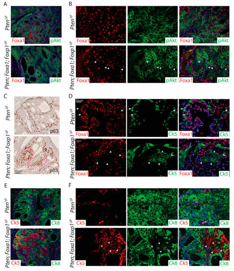 Figure 5. Loss of Foxa1 drives prostatic cell-plasticity. Paraffin sections from PtenΔP and Pten; Foxa1; Foxp1ΔP prostates were stained with antibodies. (A,B) Immunofluorescence staining for p-Akt (green) and Foxa1 (red). White arrowheads mark Foxa1 and pAkt double positive cells (n = 3). (C) IHC staining for basal cell marker p63. Red dotted line marks abnormal areas positive for basal cells in the prostatic lumen (n = 5). (D) Immunofluorescence staining for Ck5 (basal marker; green) and Foxa1 (red). White arrows mark basal cells towards the stroma in Pten-deficient samples. White arrowheads marks Ck5-positive and Foxa1-negative cells in the lumen of Pten; Foxa1; Foxp1-deficient anterior prostate lobes (n = 3). (E,F) Immunofluorescence staining for Ck5 (basal marker; red) and Ck8 (luminal marker; green). White arrowheads mark Ck5-positive and Ck8-negative cells in the prostatic lumen (n = 3). Panels on the left are taken with 10× magnification and panels on the right are taken with 40× magnification.
