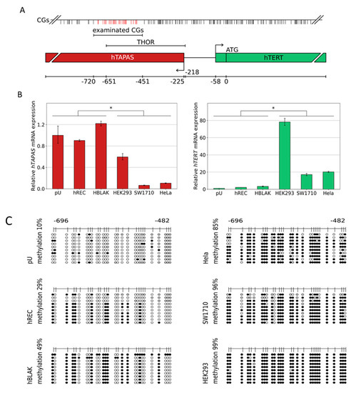 Of note, it must always be considered that further differential methylated regions contribute to the tumor-associated aberrant expression of hTERT. For instance, a positive correlation between the hypermethylation status of 27 CpG sites within the hTERT promoter core region, hTERT mRNA expression, and telomerase activity in a comprehensive investigation of 56 human tumor cell lines, as well as tumor and normal tissues from different organs, have been shown [31]. Furthermore, the results of our study should not distract from the possible case that despite the full methylation of THOR, hTAPAS repression may be in some cases uncoupled from this, and the induction of hTERT expression may be the consequence of a general increase in CpG methylation within the entire hTERT promoter. This is indicated by the full methylated THOR and the expression of hTAPAS and hTERT of HEK293 (Figure 1B,C).