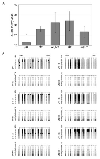 Genome-wide DNA methylation datasets were generated from pathologically reviewed and classified urothelial carcinoma and healthy urothelial tissue specimens by MeDIP and array analyses, as described in Erichsen et al. [43,47]. In brief, in this study, all other groups were compared to four samples of healthy urothelial tissue (pU). The other four groups of tissue samples consisted of ten specimens of UC from unifocal papillary tumors (UT); four specimens adjacent to unifocal tumors, histologically verified as normal urothelium (adj UT); five tissue specimens of UC from multifocal tumors (MT), and five specimens adjacent to multifocal tumors, histologically verified as normal urothelium (adjMT). For each individual sample, integrated peak values for overall methylation of the relevant CpG-rich region direct upstream of the hTERT core promoter was obtained. The mean values of these peak values were calculated for each sample group. The statistical significance of differentially methylated regions (DMRs) was calculated for each group of samples compared with the healthy urothelium reference, based on the mean peak values using two sample Student’s t-tests with a significance threshold of αDMR = 0.05. The differences in the mean values are given in Figure 2A. Within the 5′-regulatory region of hTERT, a significant hypermethylation was observed in MT, adj MT, and UT, but not in adj UT (Figure 2A).