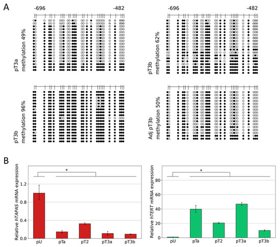 Subsequently, we measured the expression of hTAPAS and hTERT in one pTaLG, one pT2, one pT3a, and one pT3b in comparison with two primary uroepithelial tissue samples and found an inverse correlation, but less pronounced, in the pT3b sample (Figure 3B).