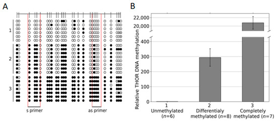 Finally, based on our data on THOR-associated differential methylated CpG patterns in urothelial cancer, we designed primers to distinguish between hypo, partial, and dense methylated CpG positions within this THOR region. As templates, we chose plasmids that after sequencing, were verified to bear the intended THOR sequences of differential methylation (Figure 4). Six plasmids with hypomethylated THOR inserts, eight plasmids with partially methylated inserts, and seven plasmids with enhanced methylated inserts were used (Figure 4A). In Figure 4B, it is documented that in this relatively quantifying EpiTHOR hTERT assay, the amplification efficiency of the hypomethylated sequences was reduced by approximately 300-fold compared with that of the partially methylated sequences. This, in turn, was reduced approximately 70-fold compared with that of the densely methylated inserts. Thus, clear differentiation of these differential methylated genetic spots is feasible by this approach.