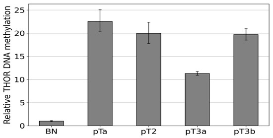 After this first proof of concept, the Epi THOR hTERT assay was also applied to primary urothelial carcinoma (Figure 5). A pTa, a pT2, a pT3a, and a pT3b were measured in comparison to a benign control (BN). The amplification efficiencies of the carcinomas were between 11- and 22-fold higher than that of the control, indicating higher methylation of the region analyzed in these tumors.