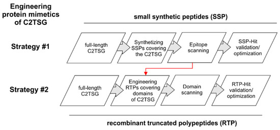 Schematic workflow to present two different strategies to engineer protein mimetics of C2TSG proteins, simulating/restoring their tumor suppressive function. Strategy #1 involves a systematic epitope scanning using partially overlapping chemically synthesized peptides covering the whole C2TSG protein to highlight hit regions. Strategy #2 follows the biological protein structure considering distinct protein domains. On this basis, truncated polypeptides are engineered and synthesized in vitro. Red arrow: data of hit regions of the epitope mapping study could be considered for prioritization of domains in Strategy #2.