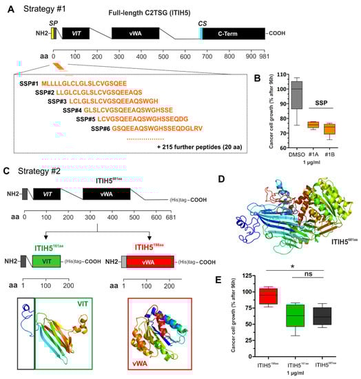 Illustration of the two strategies to engineer mimetics of C2TSG protein based on the ITIH5 example. (A) Strategy #1: Schematic cartoon of the full-length ITIH5 protein consisting of 942 amino acids (942 aa), including an illustration of the relative position of synthetic peptides (overall n = 221) covering the N-terminal protein part, i.e., from the signal peptide (SP, aa #1) to the conserved cleavage site (CS, aa #680). VIT: Vault protein inter-alpha-trypsin, vWA: von Willebrand factor, type A, C-term: Inter-alpha-trypsin inhibitor heavy chain, C-terminal. (B) Growth of breast cancer cells upon in vitro treatment with peptides #1A and #1B (each 1 µg) compared with the DMSO control using the XTT proliferation assay. (C) Strategy #2: Engineering of truncated and recombinant polypeptides either covering the VIT domain (relative aa position according to specific databases: PFAM = 51–159; Prosite profiles = 35–161) (including the endogenous SP) or the vWA domain (relative aa position: PFAM = 295–466; Prosite profiles = 295–478). (D) The three-dimensional structure of the N-terminus, the VIT, and vWA polypeptides were predicted and visualized by using Phyre 2 tool [44]. (E) Growth of breast cancer cells upon extracellular application of recombinant polypeptides (VIT and vWA, 1 µg) compared with the recombinant N-terminal ITIH5 protein by determining the living cell numbers 96 h after treatment. (ns: not significant, *: p < 0.05).