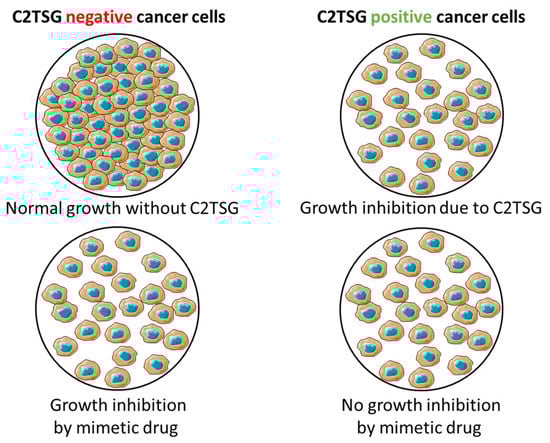 General principle of screening for mimetic drug candidates based on the CellTiter-Glo® Assay. Cancer cell line lacking C2TSG protein exhibits normal growth characteristics (top left), while cancer cell line with forced C2TSG protein re-expression exhibits growth inhibition (top right). A compound acting like a mimetic drug in C2TSG protein-negative cancer cells will have a growth inhibitory effect (bottom left), while the same mimetic drug will have no effect in C2TSG positive cancer cells (bottom right). These two aspects, taken together, make a suitable candidate for a mimetic drug candidate.
