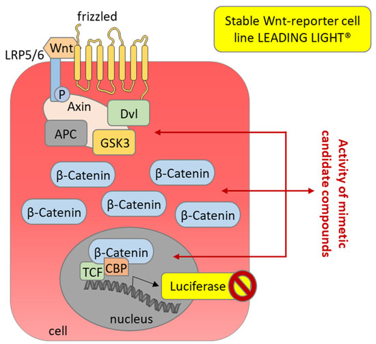 Secondary assay for the primary SFRP1 mimetic hits analyzing activity as Wnt pathway antagonist. The Wnt-reporter cell line LEADING LIGHT® (Enzo Life Sciences, Farmingdale, NY, USA) expresses luciferase upon stimulation of the Wnt pathway after the addition of recombinant Wnt3a as a Wnt signaling ligand. Candidate SFRP1 mimetic hits might inhibit the Wnt signaling pathway at different levels, which should result in inhibition of the luciferase-induced luminescence.