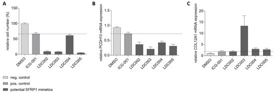 Secondary target gene assay in SFRP1-negative MCF7 breast cancer cells. Analysis of four LDC compounds (LDC002-005) and the reference inhibitor ICG-001 is shown as an example. (A) Relative cell growth in the presence of each analyzed compound is lower than for the positive control (ICG-001, dotted line). (B) Relative mRNA expression of PCDH10, a gene downregulated by SFRP1, induced by the analyzed compounds is below the cut-off of the positive control (ICG-001, dotted line). (C) Relative mRNA expression of COL12A1, a gene upregulated by SFRP1, induced by the analyzed compounds is at least as high or above the cut-off of the positive control (ICG-001, dotted line). Remarkably. LDC003 shows a highly significant COL12A1-induction effect.
