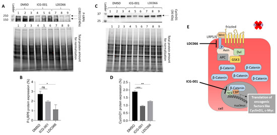 Secondary pathway assay for a representative and optimized SFRP1 mimetic hit, showing potential regulation of the Wnt/β-catenin signaling in BT20 breast cancer cells. DMSO (lanes 1, 2, 3) serves as negative diluent control and ICG-001 (lanes 4, 5, 6) as reference drug. (A,B) Protein expression of the phosphorylated LRP6 receptor (P-LRP6) shows significant down-regulation in the presence of LDC066 (LDC066 is an optimized analog of an SFRP1 mimetic screening hit, lanes 7, 8, 9), but not by ICG-001. All compounds are added as triplicates (ICG-001 at 20 µM, LDC066 at 10 µM). (C,D) Protein expression of the transcription factor cyclin D1 is significantly downregulated by ICG-001 and LDC066 since both substances down-regulate the Wnt signaling cascade at the level of gene transcription, and cyclin D1 is a TCF/CBP-regulated gene. (E) Cartoon of active Wnt/β-catenin signaling cascade. LDC066 seems to down-regulate the active LRP6 receptor (“P-LRP6”) at the cell surface, while the reference drug ICG-001 antagonizes the TCF/β-catenin/CBP-dependent transcription in the cell nucleus. Consequently, both drugs mediate down-regulation of the oncogenic transcription factor cyclin D1, a key transcription factor in active Wnt signaling. (ns: not significant, *: p < 0.05, **: p < 0.01, ***: p < 0.001).