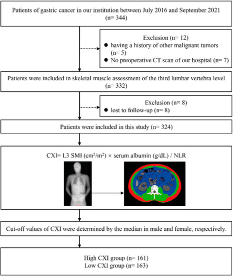 The original preoperative abdominal CT images of included patients were extracted from our hospital, and Syngo MultiModality Workplace (Siemens Medical Solutions, Forchheim, Germany) was used for analyzing the skeletal muscle area of the third lumbar vertebra (L3) level [24]. The Hounsfield unit (HU) threshold of skeletal muscle was set from −29 to 150 [25,26]. The SMI was calculated as the area of skeletal muscle (cm2) of L3/height squared (m2) [26,27]. The preoperative blood samples were taken from the anterior cubital vein with fasting of 10 h. NLR was calculated as the number of peripheral neutrophils/the number of peripheral lymphocytes [28], and the level of serum albumin was obtained from the examination reports of the Clinical Laboratory of West China Hospital. The CXI was calculated as SMI (cm2/m2) × serum albumin (g/dL)/NLR [15]. Cancer cachexia was diagnosed according to the most accepted criteria by Fearon et al.: weight loss over 5% in the past 6 months; weight loss over at least 2% and body mass index (BMI) < 20; or weight loss over at least 2% and sarcopenia [7].