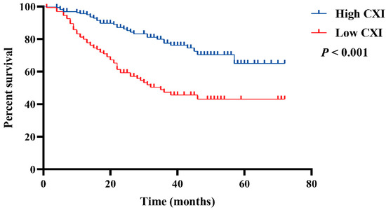 In multivariate analysis, only the CXI (HR 0.45, 95% CI 0.29 to 0.69; p < 0.001) and TNM stage (HR 4.38, 95% CI 2.54 to 7.55; p < 0.001) had significant associations with OS (Table 2). In addition, Kaplan–Meier survival curves with log-rank tests also suggested a significantly more favorable OS in patients with high CXI (p < 0.001, Figure 2).