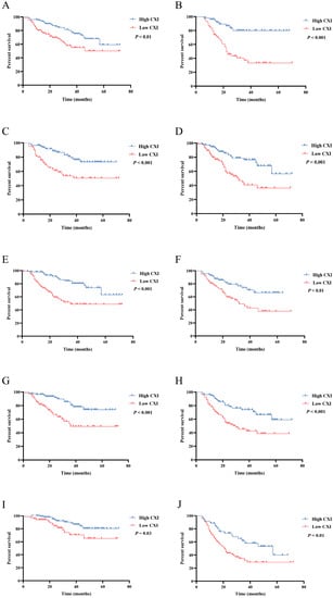 To further investigate the impact of CXI on OS under different conditions, Kaplan–Meier survival curves with log-rank tests were conducted according to sex, age, cachexia, BMI, and TNM stage. A high CXI was shown to be associated with a significantly more favorable OS in both males and females (Figure 3A,B); patients <60 and ≥60 years old (Figure 3C,D); patients without and with cachexia (Figure 3E,F); patients with BMI ≥ 22.32 and <22.32 (Figure 3G,H); and patients with TNM stage I+II and stage III+IV (Figure 3I,J).