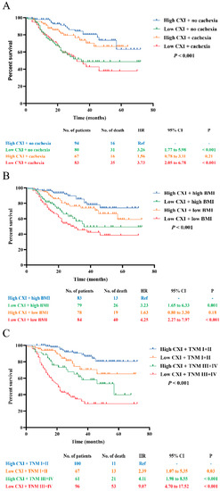 Moreover, combinations of CXI and cachexia, BMI, and TNM stage were conducted for survival analyses. Compared to those with high CXI + no cachexia, patients with low CXI + cachexia had the worst OS (HR 3.73, 95% CI 2.05 to 6.78; p < 0.001), followed by patients with low CXI + no cachexia (HR 3.26, 95% CI 1.77 to 5.98; p < 0.001). No significant difference was found between patients with high CXI + no cachexia and high CXI + cachexia (Figure 4A). In combination with CXI and BMI, we found that patients with low CXI + low BMI (<22.32) had the worst OS (HR 4.25, 95% CI 2.27 to 7.97; p < 0.001) when compared to those with high CXI + high BMI, followed by patients with low CXI + high BMI (HR 3.23, 95% CI 1.65 to 6.33; p = 0.001). There were no significant differences between patients with high CXI + high BMI and high CXI + low BMI (Figure 4B). For the combination of CXI and TNM stage, two of the significant prognostic factors in the multivariate Cox proportional hazards model, we found that patients with low CXI + TNM stage III+IV had the worst OS (HR 9.07, 95% CI 4.70 to 17.52; p < 0.001) when compared to those with high CXI + TNM stage I+II, followed by patients with high CXI + TNM stage III+IV (HR 4.11, 95% CI 1.98 to 8.55; p < 0.001) and patients with low CXI + TNM stage I+II (HR 2.39, 95% CI 1.07 to 5.35; p = 0.03), respectively (Figure 4C).
