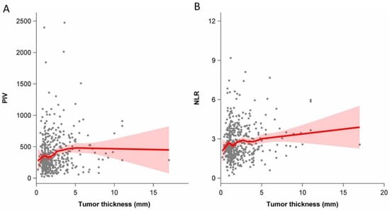 Association between tumor thickness (mm) among patients with cutaneous melanoma and the pan-immune inflammation value (PIV, (A)) and the neutrophil-to-lymphocyte ratio (NLR, (B)) (Spearman rank correlation coefficient 0.14 (95%CI 0.05–0.23) and 0.11 (95%CI 0.02–0.20), respectively); red bands indicate 95% confidence interval bands.